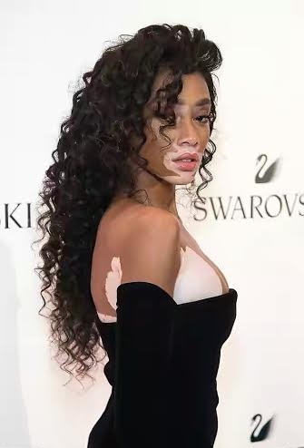 TVC E. The Canadian beauty, who suffers from the skin condition vitiligo, showed off her fabulous figure in an off-the-shoulder number with thigh-high split.